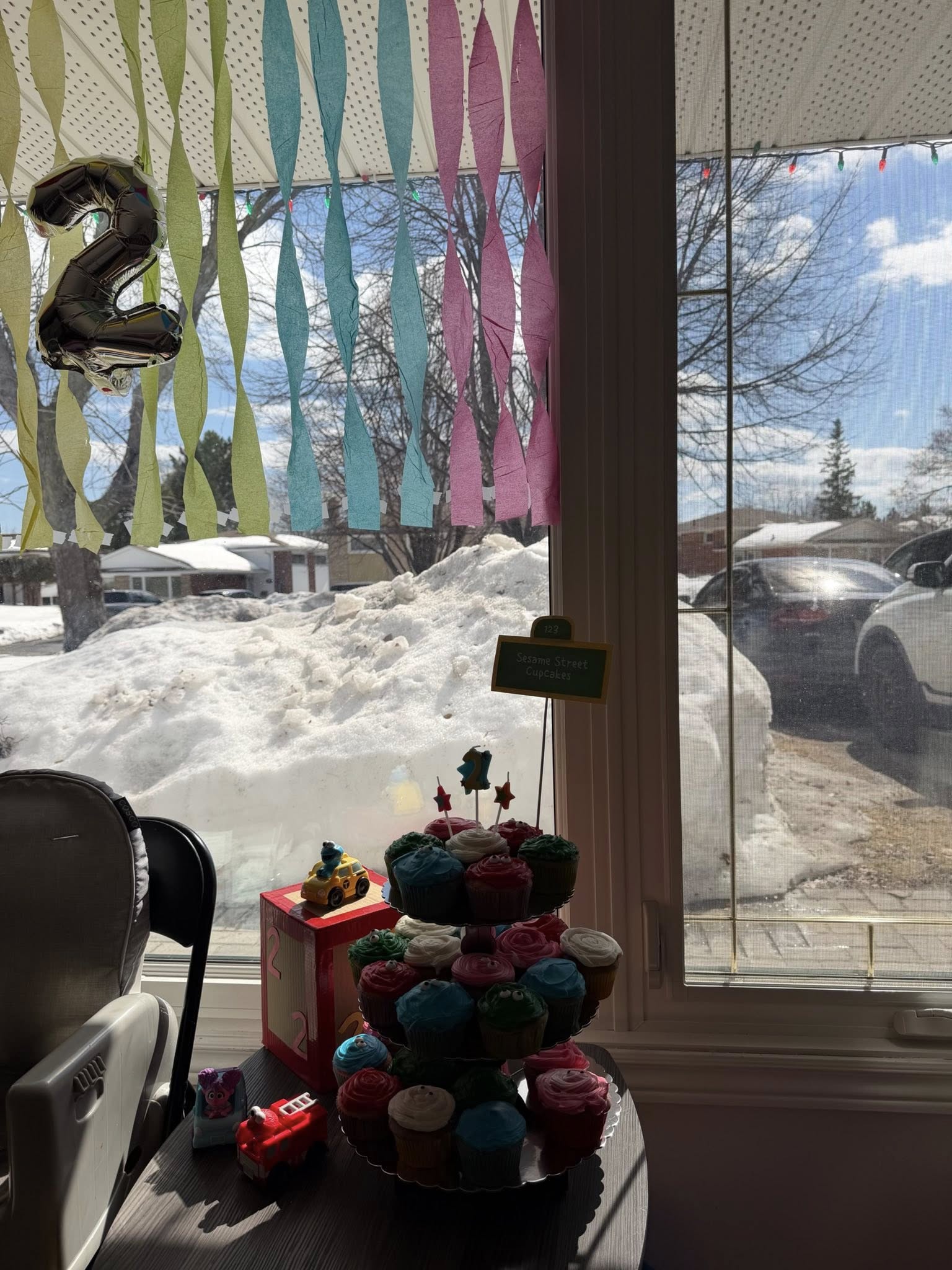 Colorful rainbow paper pom-poms and crepe streamers hanging in a window with a silver number 2 balloon decoration.