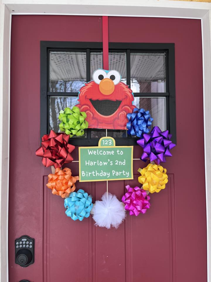 Elmo Sesame Street inspired door wreath with colorful bows and a Welcome to Harlow's 2nd Birthday Party sign.