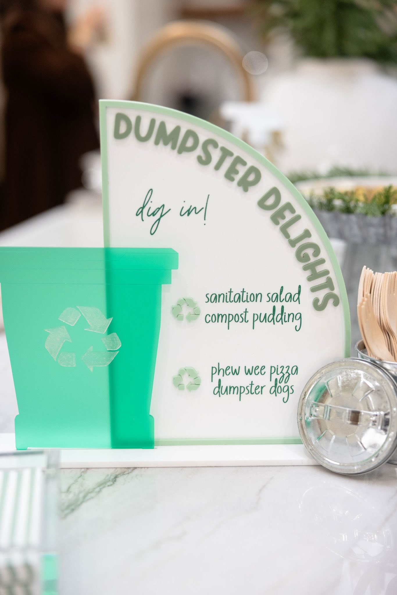 A decorative Dumpster Delights sign listing food items like sanitation salad and compost pudding.